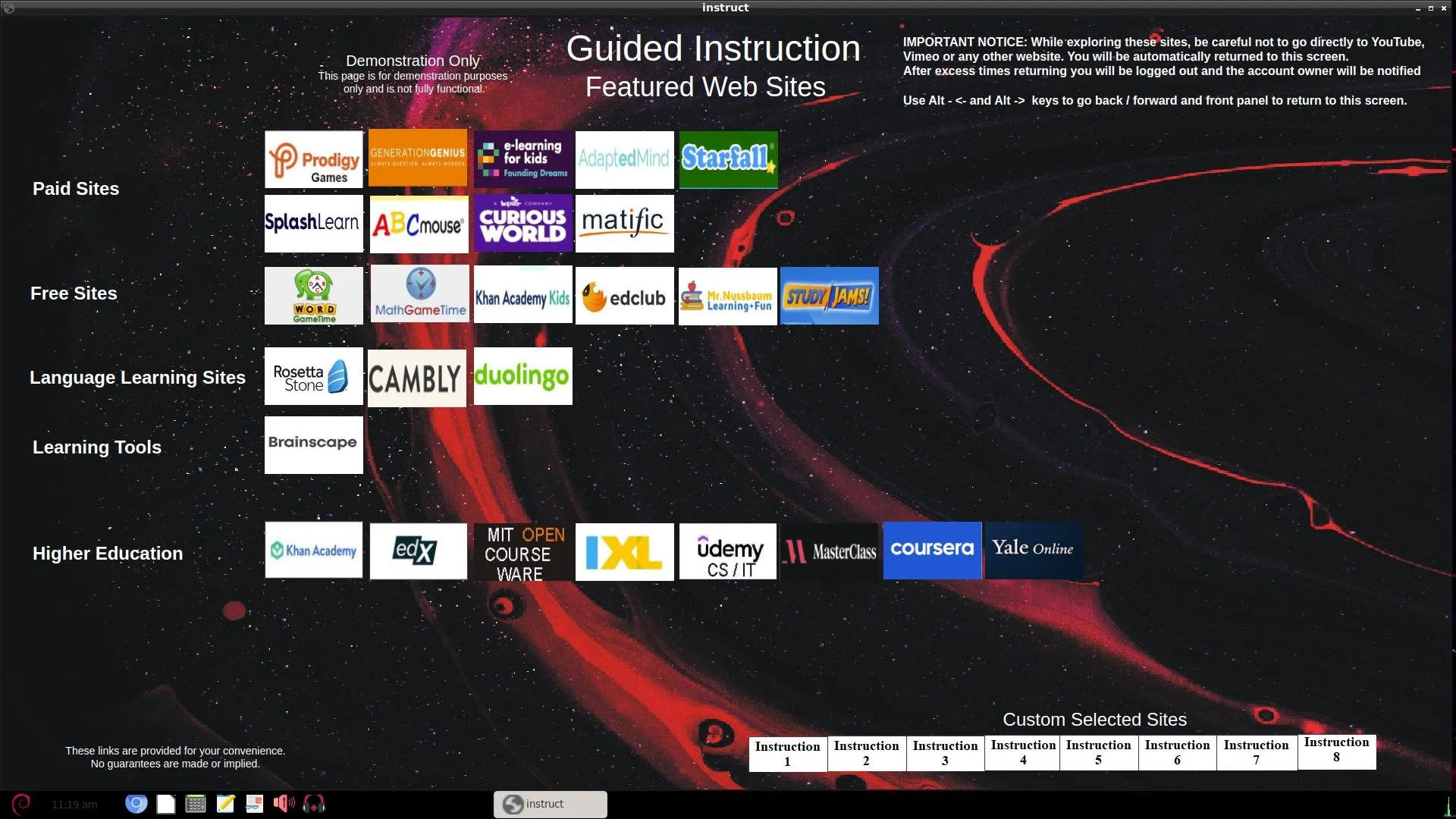 Desktop similar to the Study Desktop Mode with a special locked down Guided Instruction screen with a curated list of age-informed websites teaching academic subjects – all without distractions. These sites include free academic sites from major universities and colleges. In addition to the sites suggested by Sentinel Computers, parents can add up to 8 additional sites all users can access from this mode.